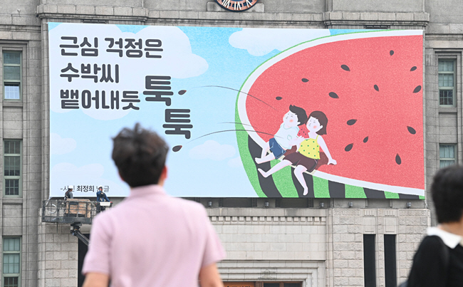 4일 오전 한 시민이 서울 중구 서울도서관 외벽의 꿈새김판에 새겨진 ‘근심 걱정은 수박씨 뱉어내듯 툭툭’이라는 문구를 바라보고 있다.