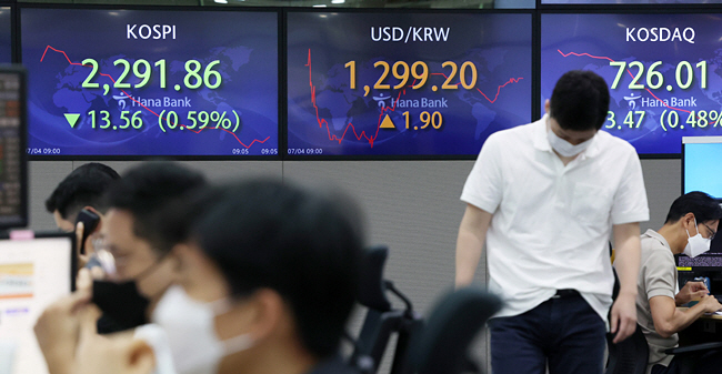 코스피가 장중 2300선 밑으로 떨어진 4일 오전 서울 중구 을지로1가 하나은행 본점 딜링룸에서 직원들이 업무를 보고 있다. 코스피는 지난 1일 약 1년 8개월 만에 장중 2300선이 무너진 데 이어 이날에도 2300선을 오르내리고 있다. 연합뉴스