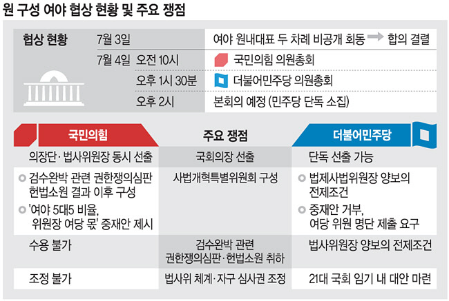더불어민주당이 4일 오후 2시 본회의를 열어 국회의장을 단독으로라도 선출하겠다고 공언한 가운데 여야의 원 구성 협상은 이날 오전까지 난항을 겪고 있다. 국민의힘은 민주당이 제안한 사법개혁특별위원회(사개특위)를 여야 동수(5대 5)로 꾸리자고 수정 제안했지만 민주당은 거부했다. 여야는 본회의 전까지는 협상 가능성을 열어 두겠다는 입장이지만, 이견이 좁혀지지 않을 경우 파행이 불가피할 전망이다. 국민의힘에서는 민주당이 단독으로 의장 선출을 강행할 경우 이에 협조하자는 의견도 나오고 있어 여야가 일단 국회의장만 선출한 뒤 다시 상임위원장 배분 등을 두고 협상에 착수할 가능성도 있다.