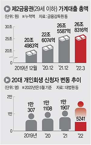 ‘영끌족’(영혼까지 끌어모음)이라는 신조어까지 등장시킨 청년들이 한국은행 사상 첫 빅스텝(기준금리 0.50%포인트 인상) 여파로 위기에 내몰리고 있다. 20대 이하의 제2금융권 가계대출 총액은 늘어나고 있으며, 개인회생을 신청하는 청년들마저 증가하고 있다. 연말까지 대출금리가 계속 오를 것으로 전망되며 청년들의 원리금 상환 부담은 더욱 가중될 것으로 보인다.