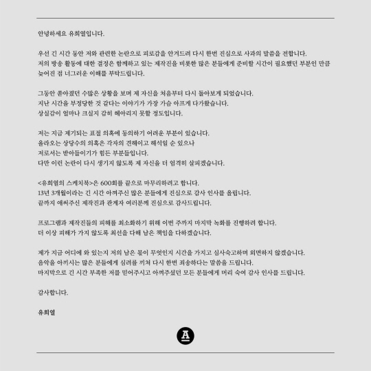 유희열은 "프로그램과 제작진들의 피해를 최소화하기 위해 이번 주까지 마지막 녹화를 진행하려한다"며 "더 이상 피해가 가지 않도록 최선을 다해 남은 책임을 다하겠다"고 말했다.