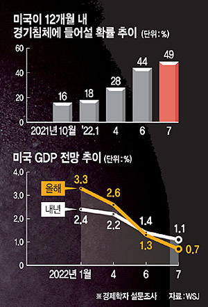 18일 월스트리트저널(WSJ)이 62명의 경제학자를 대상으로 한 설문조사 결과 ‘향후 12개월 안에 경기침체가 올 확률’에 대한 답변 평균치가 절반에 가까운 49%로 집계됐다. 이는 올해 1월 18%, 4월 28%, 6월 44%보다 높아진 수준이다. 과거 글로벌 금융위기 직전인 2007년 12월에는 38%, 코로나19 사태 직전인 2020년 2월에는 26%였다. 특히 경제학자들은 올해 미국의 국내총생산(GDP) 증가율 전망치가 0.7%에 그칠 것으로 봤다. 올해 1월 3.3%, 4월 2.6%보다 훨씬 낮아진 수준이다. WSJ는 “인플레이션, 금리 인상, 공급망 차질 등 악재가 겹친 탓”이라고 분석했다.