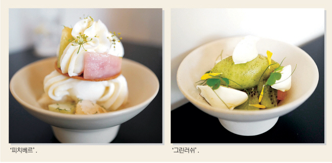 멜론·복숭아에 소금 아이스크림 얹은 ‘피치베르’ 산미 높은 과일과 허브 조합 특유의 향 ‘그린러쉬’