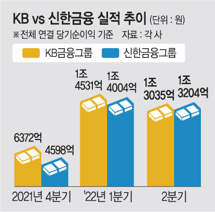 KB금융그룹과 신한금융그룹이 금리 상승 등에 힘입어 올 상반기 역대 최대 실적을 달성한 것으로 나타났다. 다만 코로나19로 어려움을 겪어온 소상공인·자영업자에 대한 대출 만기 연장 종료를 오는 9월 앞두고 충당금 적립을 확대하면서 올 2분기 순이익 규모는 감소세로 돌아섰다. 한국은행이 이달 들어 빅스텝(0.5%포인트 기준금리 인상)을 밟는 등 금리 인상 후폭풍이 하반기에도 계속될 전망이어서 금융 그룹의 실적 고공 행진은 당분간 이어질 것으로 보인다. 취약 차주에 대한 고통 분담을 요구하는 금융당국이나 사회적 여론도 커질 전망이다.