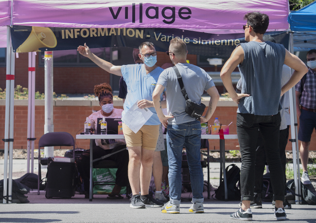 세계보건기구(WHO)가 원숭이두창을 ‘국제적 공중보건 비상사태’(PHEIC)로 선포한 23일 캐나다 몬트리올에 설치된 간이 진료소에서 의료 관계자가 원숭이두창에 효과가 있는 천연두 백신 접종을 안내하고 있다. 워싱턴포스트(WP)에 따르면 원숭이두창은 24일 현재 전 세계 74개국에서 1만6800건 이상의 발병 사례가 보고된 상태다.
