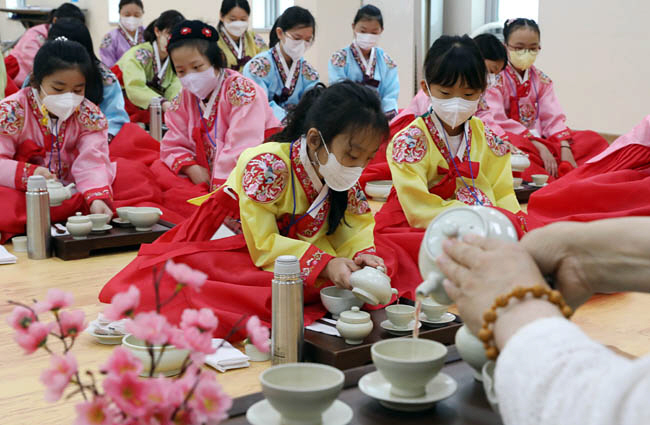 25일 부산 동래구 충렬사 안락서원 교육회관에서 한복을 차려입은 초등학생들이 다도 예절을 배우고 있다. 안락서원 ‘초등학생 여름방학 전통문화 체험교실’은 29일까지 열린다.