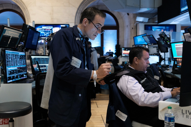 7월 미국 기준금리 인상 폭을 결정할 연방공개시장위원회(FOMC) 회의 시작을 이틀 앞둔 25일(현지시간) 뉴욕증권거래소(NYSE)에서 딜러들이 업무를 보고 있다.