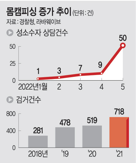 덩달아 성 소수자를 타깃으로 하는 몸캠 피싱도 늘고 있다. 몸캠 피싱 대응 기업 라바웨이브에 따르면 지난 2019년부터 2021년까지 3년간 월평균 1건에 불과했던 성 소수자 몸캠 피싱 상담 건수는 올해 1월부터 5월까지 70건으로 집계됐다. 인스타그램 DM을 통해 접근한 몸캠 피싱 상담도 급증, 올해 들어 4월까지 130건이 발생했으며, 이는 전년 대비 1.5배로 늘어난 수준이다.