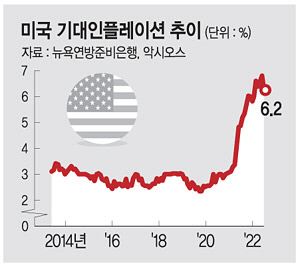 8일 미 경제매체 CNBC 등에 따르면 뉴욕 연방준비은행이 7월 소비자 설문조사를 통해 집계한 향후 1년간 기대인플레이션율이 6.2%로 나타났다. 이는 사상 최고를 기록했던 6월 6.8%에 비해 크게 낮아진 수준이다. 향후 3년간 기대 인플레이션 전망 역시 3.2%로 전월(3.6%)보다 둔화했다. 품목별로는 식료품, 휘발유 등 생활필수품을 중심으로 물가 폭등세가 진정될 것으로 예상됐다. 특히 식료품 가격은 향후 1년간 6.7% 오를 것으로 추산돼 전월 전망 대비 2.5%포인트 하락, 2013년 6월 이후 가장 큰 낙폭을 보였다.