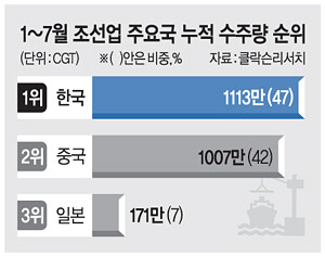 9일 영국의 조선·해운시황 분석기관 클락슨리서치에 따르면 지난달 전 세계 선박 발주량은 210만CGT(표준화물선환산톤수·70척)로, 한국이 전체 물량의 55%인 116만CGT(19척)를 수주해 2위 중국(62만CGT·35척·30%)을 따돌리고 3개월 연속 1위를 차지했다. 올해 1∼7월까지 누계 기준으로도 한국은 1113만CGT(204척·47%) 규모의 건조 계약을 따내 1007만CGT(383척·42%)를 기록한 중국을 앞섰다. 3위 일본은 171만CGT(65척·7%)를 수주하는 데 그쳤다. 한국은 누계 기준으로 지난 5월 말 45%의 점유율을 보인 뒤 6월 46%, 7월 47%로 시장 영향력을 확대하고 있다. 반면 같은 기간 중국의 점유율은 44%→43%→42%로 축소되고 있다.