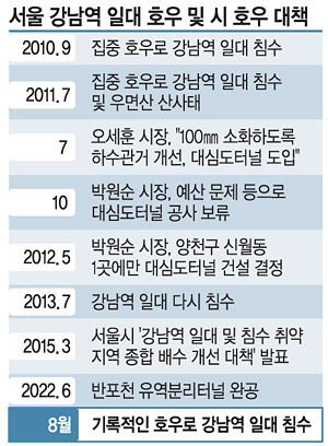 서울 강남 일대에서 침수 피해로 사망자가 나오는 등의 피해가 커진 것과 관련해서는 기록적인 폭우 탓도 있지만 수방시설 보강 계획이 시장에 따라 달라지면서 예고된 인재(人災)였다는 지적도 나오고 있다. 2011년 서초구 우면산 산사태 이후 당시 오세훈 서울시장은 10년간 5조 원을 투입하는 도시 수해 안전망 개선 대책을 발표했다. 시간당 100㎜ 집중호우도 견딜 수 있도록 하수도 관거 용량을 확대하고 방재용 대심도 빗물터널을 도입한다는 계획이 포함됐다. 대심도 빗물터널은 지상 구조물의 영향을 받지 않는 지하 깊은 곳에 설치되는 배수터널을 말한다. 하지만 2011년 새롭게 취임한 박원순 시장은 예산 등이 과도하게 들어간다며 대심도 빗물터널 공사 등을 보류했다. 이후 대심도 빗물터널 공사를 당초 7곳에서 강남 일대 등을 빼는 등 양천구 신월동 1곳으로 줄이면서 관련 예산을 대폭 축소했다. 시는 대신 2015년 ‘강남역 일대 및 침수 취약 지역 종합 배수 개선 대책’을 발표했지만 그나마도 예산·설계 문제 등으로 지연이 계속됐다. 박창근 가톨릭관동대 토목공학과 교수는 “대심도 빗물터널 효과에 대한 분석 등을 통해 설계를 다시 해야 한다”고 말했다.