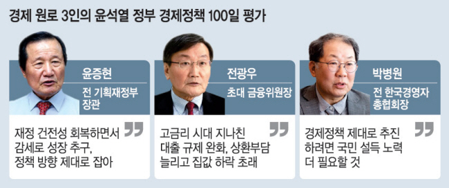 경제 원로들은 오는 17일 출범 100일을 맞는 윤석열 정부의 경제정책에 대한 중간 평가를 묻는 질문에 “전 정부의 방만한 재정운영을 바로잡는 긴축 재정과 규제혁신을 통한 민간주도의 경제성장이라는 중장기 방향을 잘 설정했다”고 한목소리로 말했다. 원로들은 글로벌 불확실성 탓에 한국경제가 ‘고금리·고물가·고환율’에 신음하고 있다고 진단한 뒤 “정부가 복합위기를 맞고 있는 경제를 살리기 위해서는 적기(골든타임)에 흔들림 없이 경제정책을 추진할 수 있는 국정 동력을 회복해야 할 것”이라고 당부했다.
