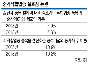 중기적합업종 제도의 경제적 효과에 대한 의문도 지속해서 제기되고 있는 실정이다. 김민호 한국개발연구원(KDI) 연구위원은 최근 ‘중소기업적합업종 제도의 경제적 효과와 정책 방향’ 보고서를 통해 “중기적합업종 합의 신규 신청을 중지하고 점진적 폐지를 추진할 필요가 있다”고 지적했다. 김 연구위원이 2008년부터 2018년까지의 광업·제조업 조사 자료를 활용해 비교한 결과 유의미한 경제적 효과는 없었던 것으로 나타났다. 오히려 전체 품목 출하액 대비 중기적합업종 품목의 중소기업 출하액은 이 기간 7.9%에서 7.6%로 감소했다.
