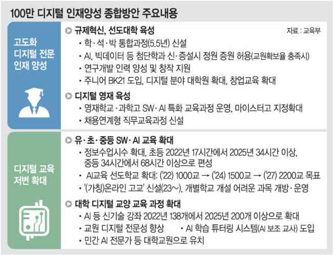 ■100만 디지털 인재 양성 방안 첨단학과 신·증설 땐 정원 증원 대학 디지털 교양 교육과정 확대 영재학교·과학고 특화과정 운영 AI 학습 보조 교사 시스템 도입