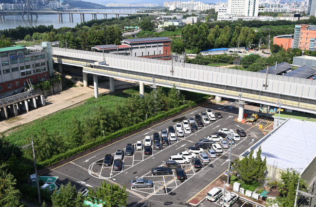 송파구 신천유수지 공영주차장. 45도로 꺾어진 주차 구획선에 맞춰 주차된 차량들의 모습이 이채롭다.