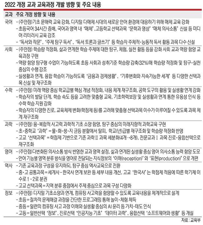2025년부터 적용되는 2022 개정 교육과정은 현행 교육과정에 비해 미래 사회에 대비한 디지털 교육과 관련 문해력 향상이 강조된다. 고교학점제에 대비해 학생의 과목 선택권이 넓어지지만, ‘국·영·수’ 수업 시간이 감축된다.