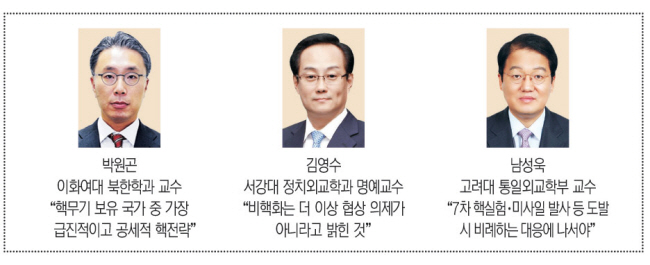 김영수 서강대 정치외교학과 명예교수는 “비핵화는 더 이상 없다는 의미”라고 단언했다. 김 명예교수는 “북한에서는 법제화라는 것이 필요 없는데도 이를 공포함으로써 비핵화는 더 이상 의제가 아니라는 사실을 분명히 했다”고 말했다. 북한의 추가 도발에 대해서는 상응하는 군사적 조치에 나설 필요가 있다는 목소리도 나오고 있다. 남성욱 고려대 통일외교학부 교수는 “2개의 시나리오가 있을 텐데 7차 핵실험 등 북한의 도발이 발생하는 경우 한국은 그에 비례하는 군사 대응을 보여줘야 한다”고 언급했다. 남 교수는 “북한 도발이 없는 경우에는 한국에서도 맞대응은 의미가 없다는 판단을 하고 군사적 반응은 피해야 한다”고 제언했다.