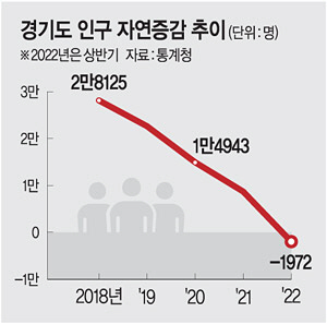 15일 통계청 등에 따르면 지난 상반기 경기도의 인구 자연증가건수(출생아에서 사망자를 뺀 수)는 -1972명으로 집계됐다. 지난 2012년 경기도의 자연증가건수는 7만391명으로 전국에서 가장 높은 수치를 보였으나 매년 증가율이 감소해 지난해에는 8700명으로 줄어들었고 올해부터는 사망자 수가 출생아 수를 넘어섰다. 서울의 치솟는 집값에 밀려난 이주민과 일자리를 찾아 올라온 비수도권 인구의 계속된 전입으로 경기도 인구는 매년 증가세를 보여왔으나 인구 자연감소 여파로 경기도 역시 2039년 1479만 명을 정점으로 내리막을 걸을 것으로 예상되고 있다.