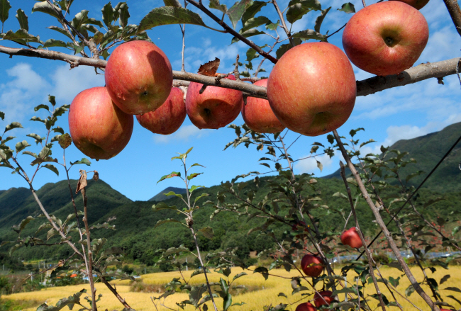 논배미 옆 사과밭에는 사과가 주렁주렁 열렸습니다.