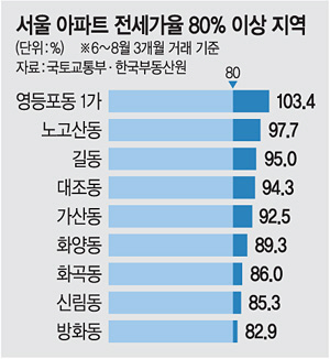 19일 국토교통부와 한국부동산원의 수도권 읍·면·동 단위 전세가율 데이터를 보면, 최근 3개월(6∼8월) 거래 기준으로 서울에서 아파트 전세가율이 80% 이상인 동은 영등포구 영등포동 1가(103.4%), 마포구 노고산동(97.7%), 강동구 길동(95.0%), 은평구 대조동(94.3%), 금천구 가산동(92.5%) 등 9곳이었다.