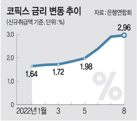 19일 금융권에 따르면 5대 시중은행(KB국민·신한·하나·우리·NH농협)의 신규 코픽스(COFIX·자금조달비용지수) 기준 주담대 변동형 금리는 4.44∼6.4%로 나타났다. 5대 시중은행 모두 주담대 최고 금리가 6%를 넘어섰다. 변동형 전세대출 금리도 3.75∼6.11% 수준이다. 가계대출 가운데 변동금리 대출자 비중은 78%로, 10명 중 8명은 금리 상승 시 곧바로 이자 부담이 커지게 된다. 주담대 금리가 계속 높아지는 데는 코픽스 금리가 2013년 이후 최고치를 찍는 등 상승세가 계속되고 있기 때문이다. 8월 신규 취급액 기준 코픽스는 2.96%로 올해 1월보다 1.32%포인트나 뛰었다. 8개월 만에 거의 두 배가 오른 셈이다. 기준금리 인상이 본격화된 지난해 8월(1.02%)과 비교해도 2%포인트 가까이 높아졌다.