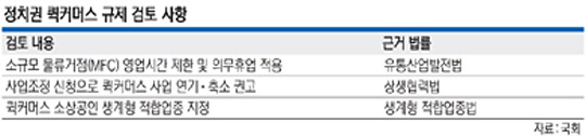 앞서 소상공인 단체들은 배달의민족이 운영하는 ‘B마트’, 쿠팡의 ‘쿠팡이츠마트’ 같은 퀵커머스가 골목상권을 침해하고 있다고 주장하며 규제 필요성을 제기해 왔다. 소상공인들은 퀵커머스가 MFC를 통해 소비자에게 상품을 바로 배송하기 때문에 사실상 상권을 공유하는 ‘소매 점포’로 보고, 기존 대형마트나 슈퍼마켓의 영업 규제를 적용해야 한다는 입장이다. 일부 소상공인 단체는 퀵커머스를 ‘소상공인 생계형 적합업종’으로 지정해달라고 정부와 정치권에 요구하고 있는 상태다. 생계형 적합업종에 지정되면 대기업과 중견기업은 3년간 해당 사업에 진입할 수 없고 사업 인수나 확장도 금지된다. 한 대형 유통업체 관계자는 “퀵커머스가 소규모 점포나 지역상권에 부정적인 영향을 준다는 명확한 근거가 없다”며 “새 정부가 추진했던 대형마트 의무휴업제 폐지 등 규제 개혁이 주춤한 상황에서 퀵커머스마저 규제가 강화될 경우 업계가 느끼는 실망감은 더욱 커질 것”이라고 말했다.