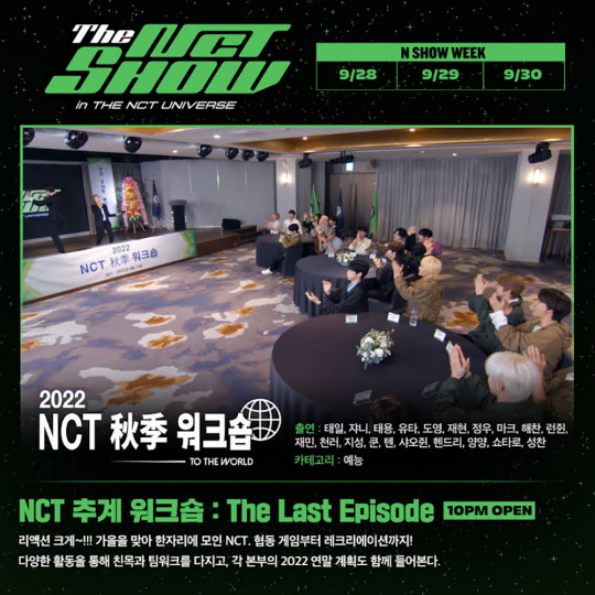 더불어 워크숍 마지막 코너로 NCT 멤버들이 2022년 하반기 각 팀의 계획을 프레젠테이션 하는 시간을 가지고 ‘THE NCT SHOW’ 2022년 시즌을 마무리할 계획이다.