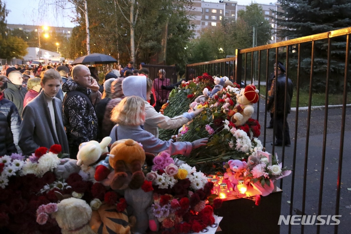 26일(현지시간) 러시아 우드무르티야공화국 이젭스크에 있는 88번 학교에서 총격이 발생한 후 사람들이 희생자들을 기리며 헌화하고 있다. 경찰은 무장 괴한이 이 학교에서 총기를 난사해 어린이 11명 등 15명이 숨지고 24명이 다쳤다고 밝혔다.