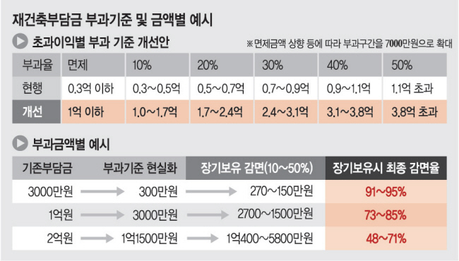 재건축 초과이익환수 금액 기준이 기존 3000만 원에서 1억 원으로 상향된다. 부과구간도 기존 2000만 원 단위에서 7000만 원 단위로 확대되는 한편, 초과이익 산정 개시 시점도 조합설립 인가일로 조정된다. 1주택으로, 10년 장기 보유한 조합원의 경우 재초환 부담금이 최대 50%까지 감면된다.