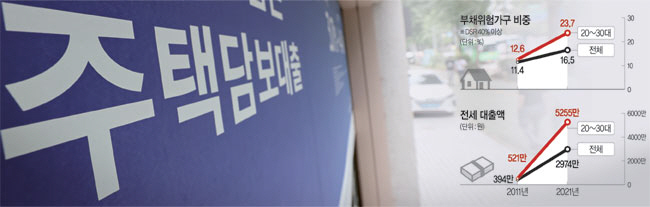 가계금융(복지)조사 자료를 분석하면 총량이 아닌 개별 가구별 부채 상황을 파악할 수 있다. 전체 부동산 보유가구 중 ‘가처분소득 대비 원리금상환액’(DSR)이 40% 이상인, 가벼운 의미의 ‘부채위험가구’ 비중은 2011년 11.4% 수준이었으나 2021년 16.5%로 높아졌다. 연령대로 보면 20∼30대 가구 중 부채위험가구 비율이 해당 기간 12.6%에서 23.7%로 유난히 높아졌다. 이는 청년층의 ‘영끌’ 현상의 부작용을 반영하는 것으로 분석된다.