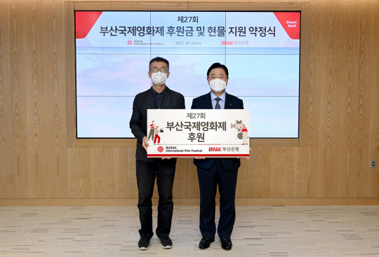 양측은 28일 BNK부산은행 본점에서 제27회 부산국제영화제 후원금 약정을 체결했다. 약정식에는 부산국제영화제 허문영 집행위원장과 오석근 아시아콘텐츠&필름마켓 운영위원장이 참석했다. 이에 따라 부산은행은 올해도 부산국제영화제의 골드 스폰서로 참여하게 됐다.