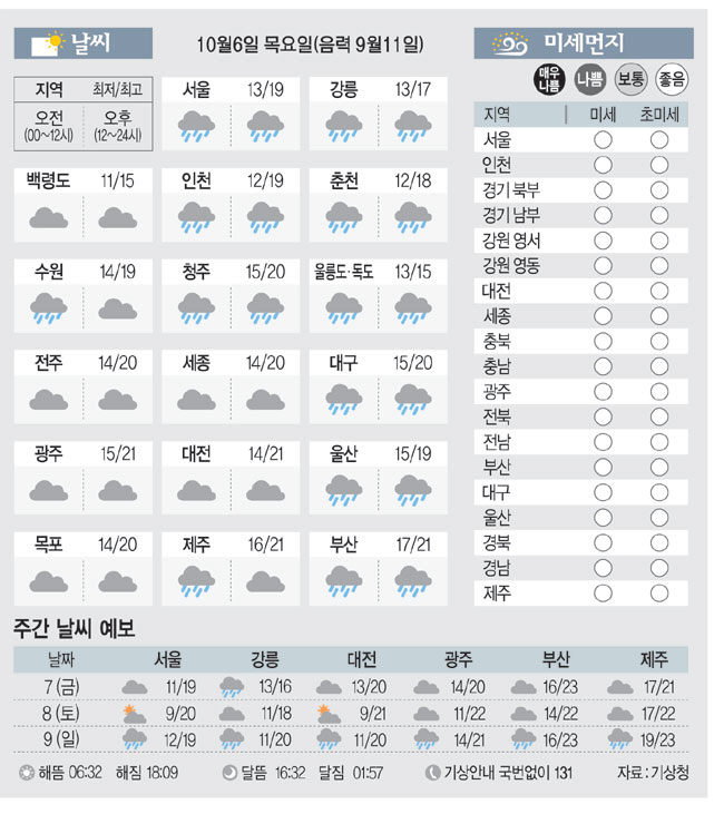 <날씨이야기>10월6일 목요일(음력 9월11일)