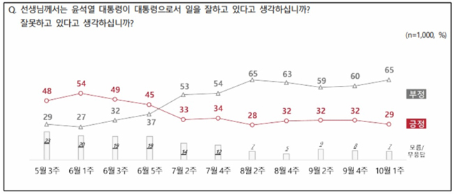 윤 대통령 국정운영은 긍정 평가가 29%, 부정 평가가 65%로 집계됐다. 9월 4주 조사와 비교하면 긍정은 3%포인트 하락했고, 부정은 5%포인트 상승했다. 부정은 역대 최고였던 8월 2주 조사와 같다. 정당 지지도는 국민의힘 34%, 더불어민주당 32%로 나타났다. 국민의힘은 9월 4주에서 변동이 없고, 민주당은 3%포인트 상승했다.