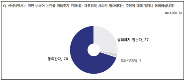 엠브레인퍼블릭ㆍ케이스탯리서치ㆍ코리아리서치ㆍ한국리서치가 지난 3∼5일 전국 18세 이상 남녀 1000명을 대상으로 진행한 10월 1주 전국지표조사(95% 신뢰수준에 표본오차 ±3.1%포인트)에서 ‘비속어 논란을 매듭짓기 위해 대통령의 사과가 필요하다는 주장에 얼마나 동의하는가’라는 질문에 ‘동의한다’가 70%, ‘동의하지 않는다’가 27%로 나타났다. ‘모름·무응답’은 3%였다.