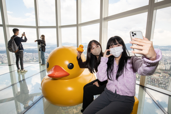 롯데월드가 서울 송파구 롯데월드타워 전망대에서 진행 중인 러버덕 연계 전시 행사를 찾은 관람객들이 러버덕과 기념촬영을 하고 있다.