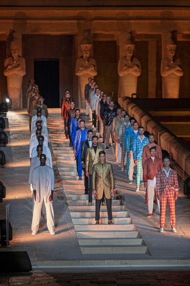 지난 9일(현지시간) 이집트 나일강 서안에 있는 고대 이집트 파라오 핫셉수트의 신전에서 열린 이탈리아 디자이너 스테파노 리치 패션쇼에서 모델들이 의상을 선보이고 있다.