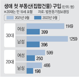 12일 대한민국 법원 등기정보광장의 생애 첫 부동산 매수인(집합건물 기준) 데이터에 따르면, 처음으로 집을 산 서울 지역 30대 여성은 지난해 9월 1149명에서 올해 9월 399명으로 급감했다. 지난해의 34.7%로 감소한 것이다. 30대 남성은 같은 기간 1259명에서 396명으로 줄어, 1년 새 31.4% 수준이 됐다. 이에 남녀를 합친 30대 전체 매수자는 지난해 같은 달에 견줘 33.0%에 그쳤다.