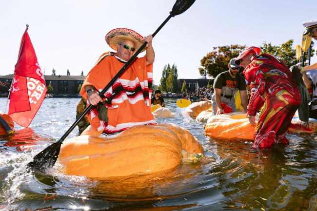 미 오리건주 워싱턴카운티 투알라틴 호수에서 열린 거대 호박 보트 경주대회에서 한 남성이 호박 위에서 노를 젓고 있다. AFP 연합뉴스