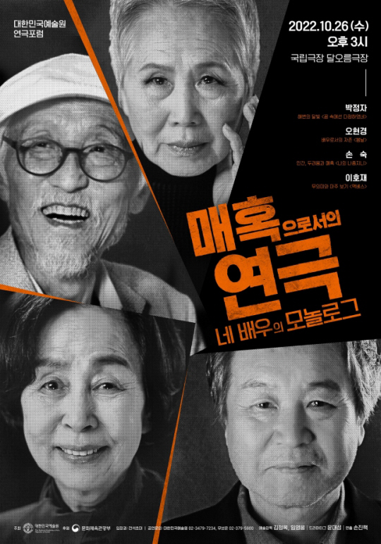 대한민국예술원(회장 유희영)은 26일 오후 3시 국립극장 달오름극장에서 박정자, 오현경, 손숙, 이호재 등 우리나라를 대표하는 배우이자 대한민국예술원 회원의 ‘네 배우의 모놀로그’ 무대를 마련한다. 4명의 배우는 각자의 대표작을 통해 축적된 연기 내공을 보여줄 예정이다. 박정자는 ‘꿈속에선 다정하였네’를 통해 해변의 달빛과 같은 이야기를, 오현경은 ‘봄날’의 한 대목을 통해 배우로서의 자존을, 손숙은 ‘나의 가장 나종 지니인 것’을 통해 인간, 두려움과 매혹에 대해, 이호재는 ‘맥베스’를 통해 무의미와 마주하는 것에 대해 이야기를 풀어낸다.