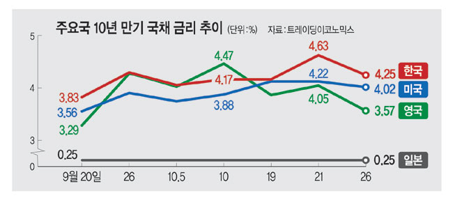 ◇구두 개입 나선 미국 = 영국의 불안은 미국으로 이어질 조짐을 보이고 있다. 미국 10년물 국채금리 역시 상승세를 거듭하고 있기 때문이다. 중앙은행인 연방준비제도(Fed)가 기준금리를 올리며 10년물 국채금리가 1984년 이후 12주 연속 최장기 상승하는 가운데, 영국발 금융불안이 가세해 최근에는 장중 4.3%를 넘어서며 14년 만에 최고치를 찍었다. 이에 미국에서도 신용 경색 경고음이 나오기 시작했다.