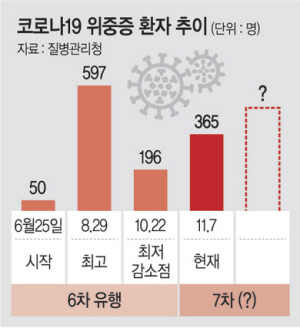 7일 질병관리청에 따르면 이날 0시 기준 위중증 환자는 전날보다 19명 늘어난 365명이다. 이는 지난 9월 28일(375명) 이후 40일 만에 가장 많은 수치다. 최근 1주일간(11월 1~7일) 하루 평균 위중증 환자는 316명으로, 전주(10월 25~31일) 256명에 비해 60명 늘었다. 겨울철을 앞두고 좀처럼 줄지 않던 위중증 환자 수가 다시 증가세를 타고 있는 것이다.