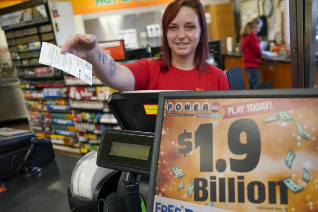 미국 ‘파워볼’ 당첨금이 전 세계 복권 사상 최고액인 19억 달러(약 2조6338억 원)로 불어난 가운데 7일 펜실베이니아주 렌프루의 한 편의점에서 직원이 구매자에게 복권을 건네고 있다. ‘파워볼’은 8월 3일부터 40회 연속 1등 당첨자가 나오지 않은 상태로 현지시간 7일 밤 추첨이 예정돼 있다.