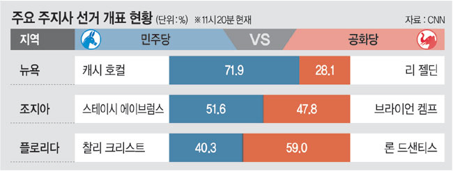 ‘트럼프 키즈’ 주지사들의 선거 결과에도 관심이 쏠린다. 격전지로 꼽히는 애리조나주에서는 폭스뉴스 앵커 출신 캐리 레이크 공화당 후보가 케이티 홉스 민주당 후보를 바짝 추격하고 있다. 레이크 후보는 선거 유세 과정에서도 조 바이든 미국 대통령이 당선됐던 2020 대통령 선거가 ‘사기’라고 주장하고 있다.