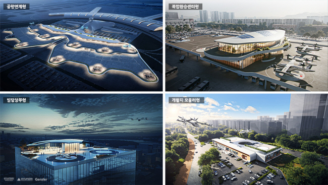 현대건설은 한국형 UAM 버티포트 유형을 △공항연계형 △빌딩상부형 △복합환승센터형 △개활지 모듈러형 등 4가지로 구분해 콘셉트 디자인을 제시했다. 기존 공항터미널 인프라와 도심 건축물 옥상부, 버스터미널 상부, 강변이나 막힘 없이 트인 넓은 지형 등을 활용해 유형별로 개념 설계안을 제작했다.