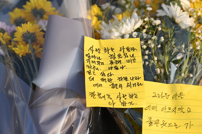 11일 오전 서울 용산구 이태원역 1번 출구 앞 추모 공간에 ‘이태원 핼러윈 참사’ 희생자 아빠가 숨진 아들을 그리워하며 쓴 메시지와 꽃이 놓여 있다.