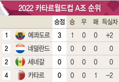 카타르는 에콰도르전 완패로 16강 진출 가능성이 쪼그라들었다. 국제축구연맹(FIFA) 랭킹 50위 카타르는 A조 최약체이나 홈 이점을 보유했기에 16강 진출 가능성이 크게 점쳐졌다. 그러나 44위 에콰도르에 완패했기에 8위 네덜란드, 18위 세네갈과의 경쟁에서 우위를 점하기는 쉽지 않아 보인다. 카타르가 조별리그를 통과하지 못하면 역대 2호가 된다. 이전까지 21차례 월드컵 중 2010 남아프리카공화국월드컵에서만 개최국이 조별리그 문턱을 넘지 못했다. 역대 월드컵 개최국의 조별리그 통과 비율은 무려 95%다.