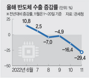 한국경제의 주력 수출 품목인 반도체와 최대 교역국인 대중(對中) 수출 규모가 이달 들어 1년 전보다 30% 가까이 급감하고 있는 것으로 드러났다. 지난달에 이어 수출이 두 달 연속 마이너스를 기록할 수 있다는 우려가 잇따르고 있다.
