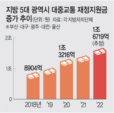 22일 각 지자체에 따르면 대중교통 수송분담률 하락으로 지방 5대 광역시가 2018~2022년 사이 투입한 총 재정지원금은 6조3441억 원이다. 또 총 재정지원금은 2018년 8904억 원이었으나 올해는 1조6719억 원으로 5년 사이 1.87배로 증가했다. 이 기간 부산시는 3738억 원에서 6500억 원으로 1.73배, 대구시는 2858억 원에서 5253억 원으로 1.83배로 증가했다. 지하철이 없는 울산시는 311억 원에서 1174억 원으로 무려 3.77배로 폭증했다.