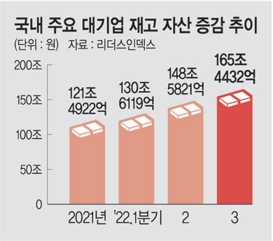 이날 기업분석연구소 리더스인덱스가 매출 기준 상위 500대 기업 가운데 재고 자산을 공시한 195개 기업의 재고 자산 변동 현황을 분석한 결과에서는 3분기 말 기준 재고 자산이 165조4432억 원으로 집계됐다. 지난해 말(121조4922억 원)보다 36.2%(43조9510억 원) 증가한 것으로, 지난 2010년 이후 최대 규모다. 국내 대표 반도체 기업인 삼성전자와 SK하이닉스의 경우 3분기 말 재고가 각각 36조7204억 원, 3조4244억 원으로 집계돼 지난해 말보다 42.6%, 174.7% 증가했다.