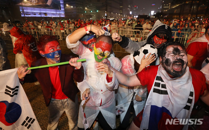 2022 카타르월드컵 조별리그 2차전 대한민국과 가나와의 경기가 열리는 28일 서울 종로구 광화문광장에서 붉은악마들이 경기 전 거리응원을 펼치고 있다.